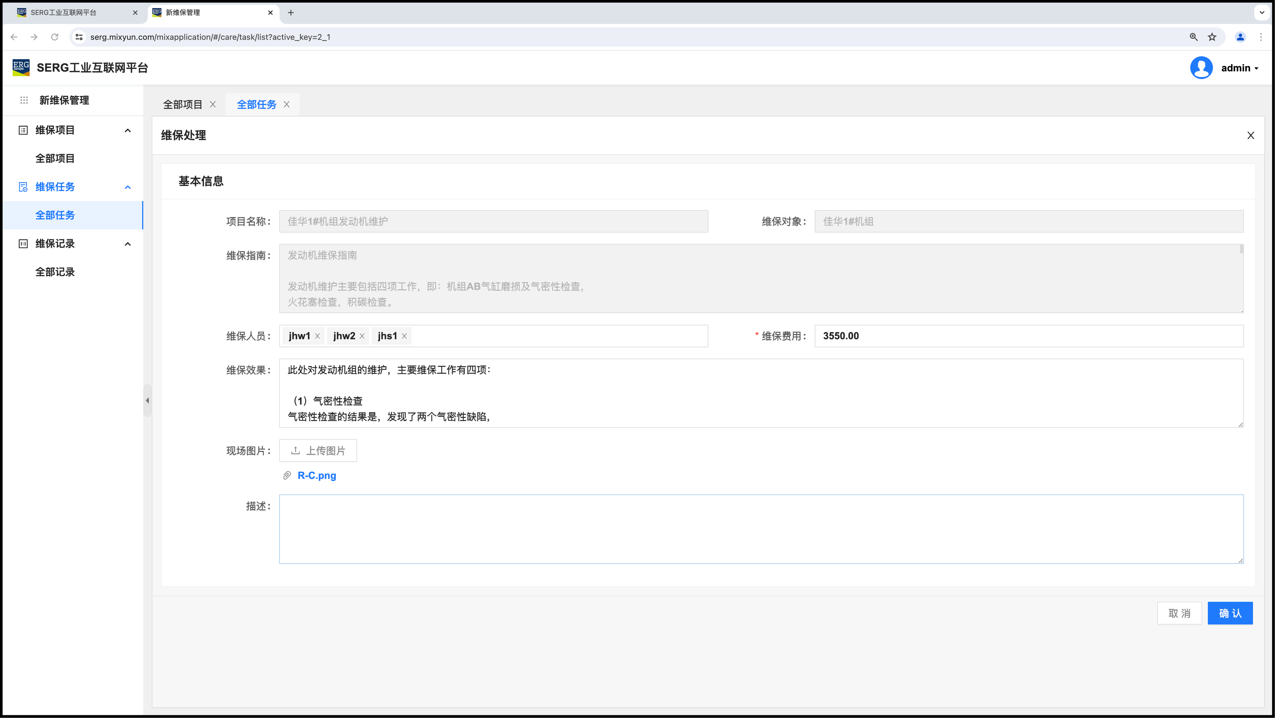 维保任务的处理,就是对这个维保任务的完成情况做一个记录:
