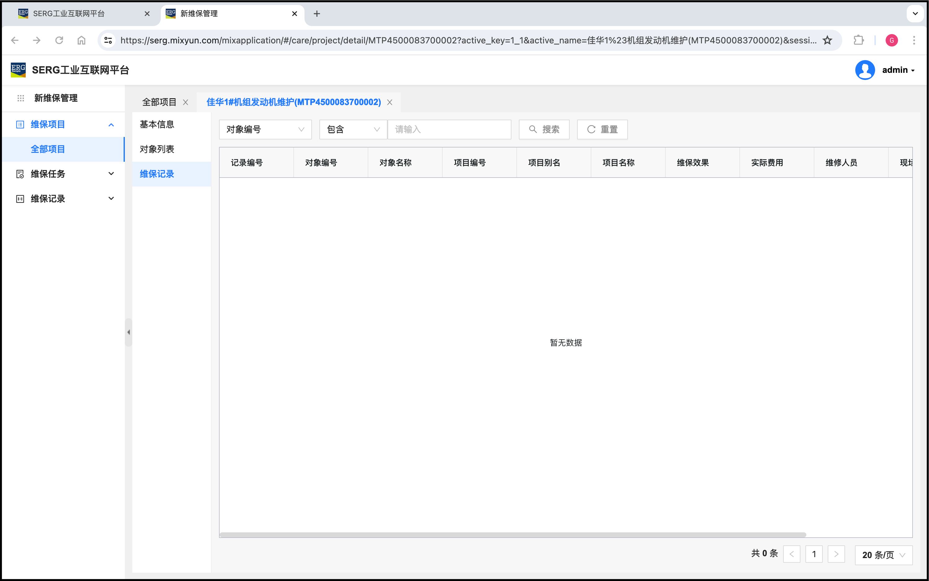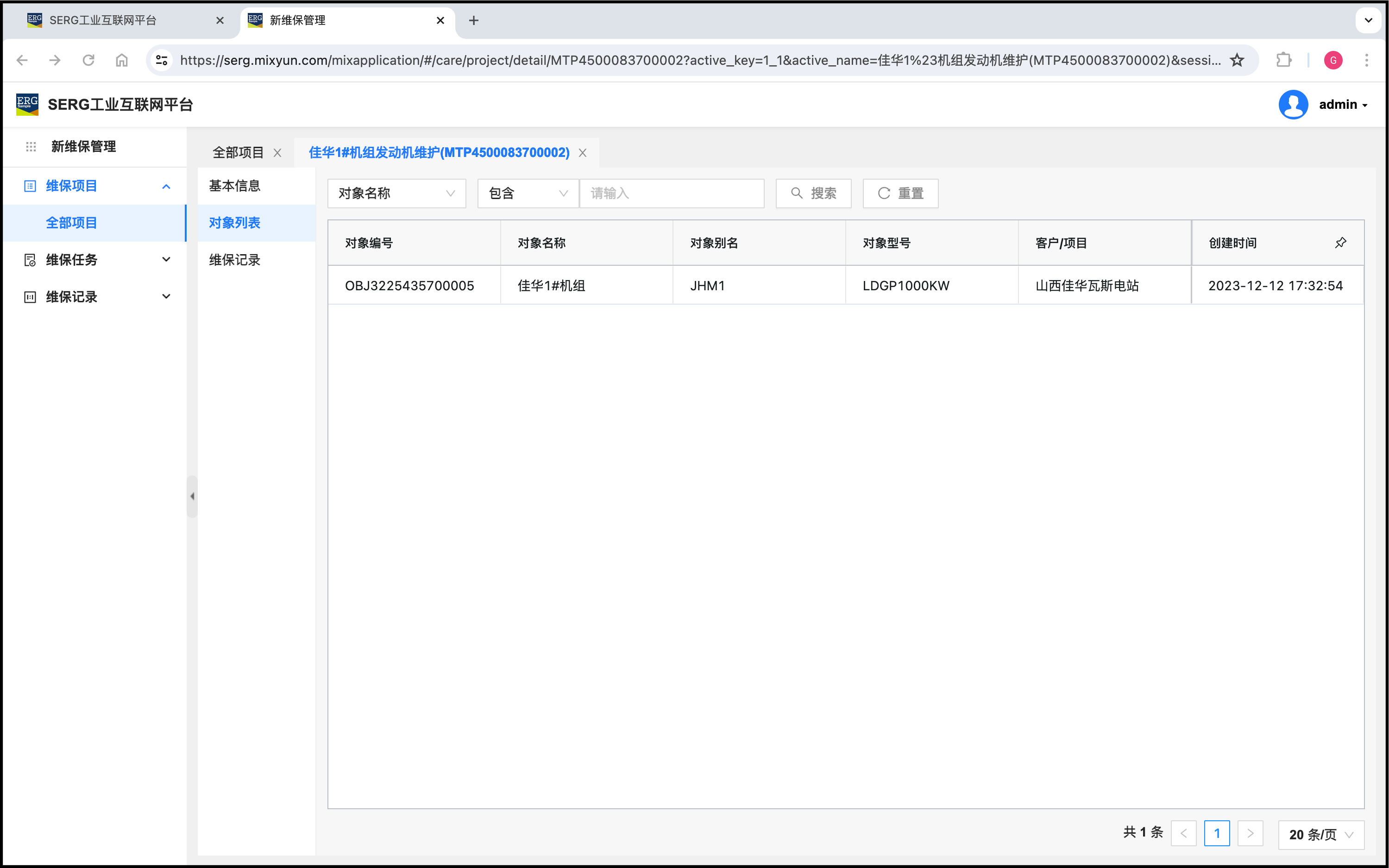再看一下这个维保项目的关联对象只有一个,就是佳华1#机组: