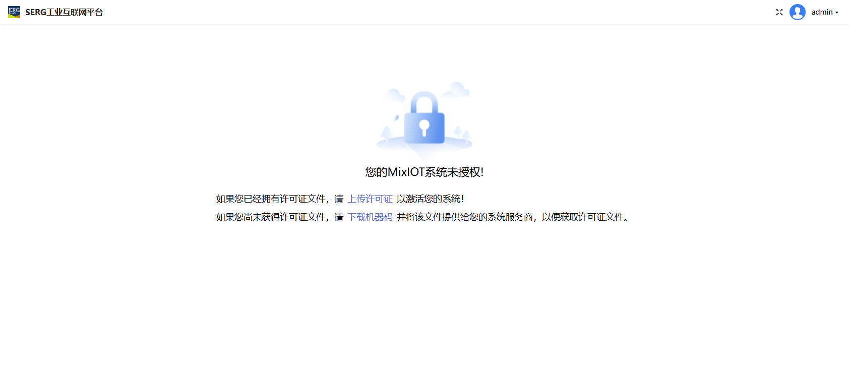 初次使用系统,会看到 你的MixIOT系统未授权 提示。 如果您已有许可证授权文件,点击 上传许可证 加载许可证以激活系统使用。 如果您尚未获得许可证文件,点击 下载机器码 并将该文件提供给您的系统服务商,以便获取许可证文件。文档更新时间: 2024-11-26 15:20 作者:Mixiot
