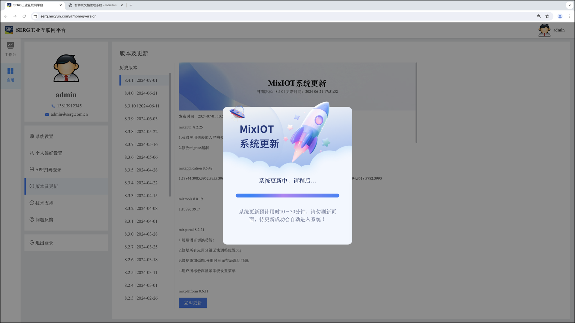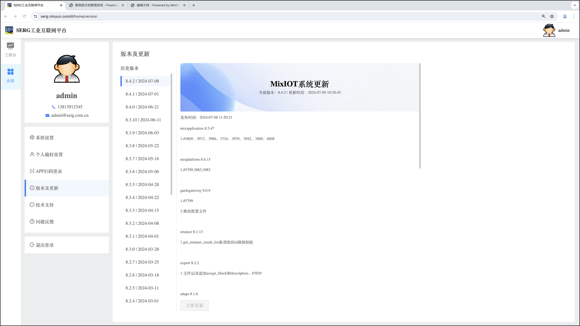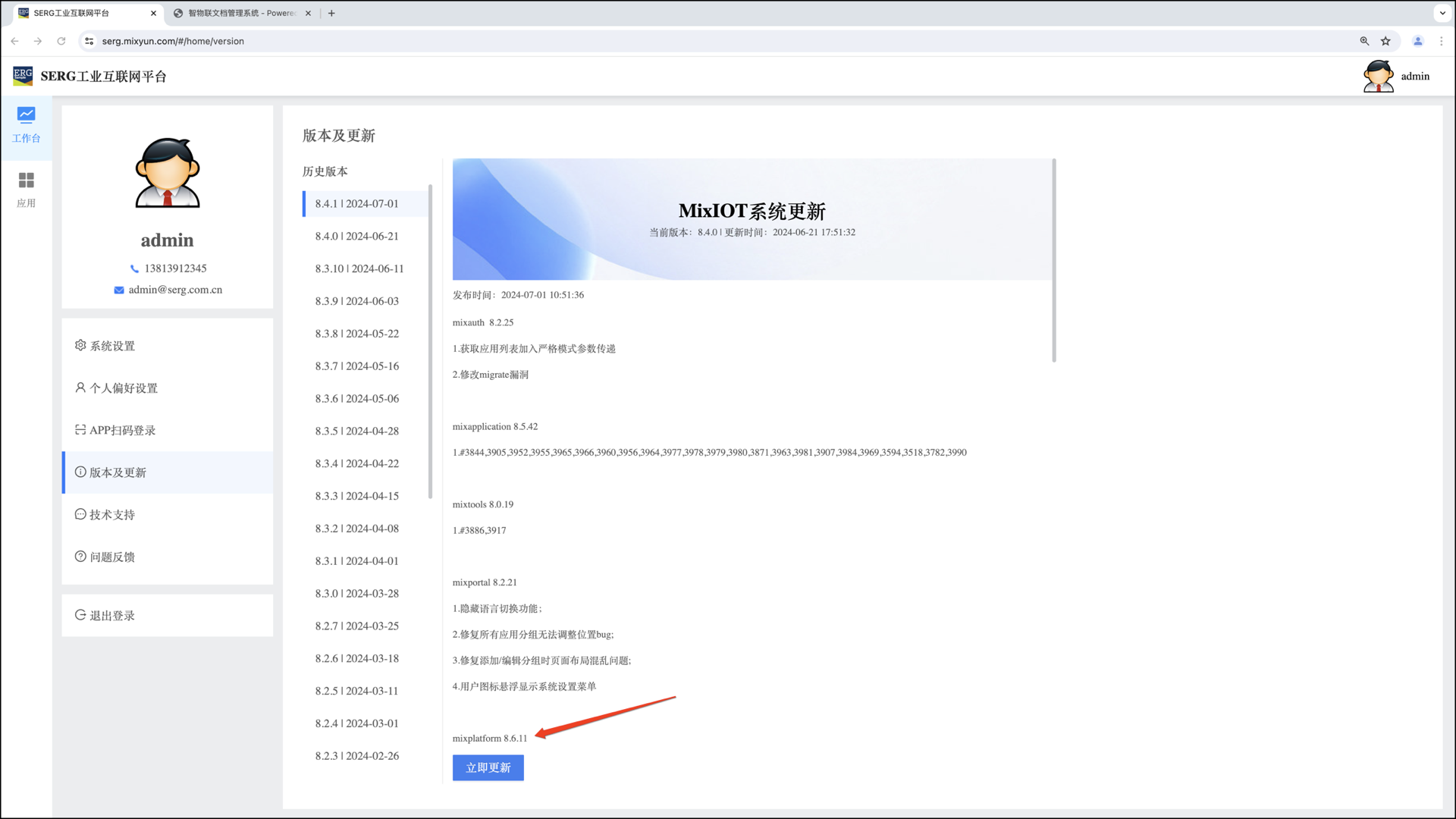 Mixiot 系统的版本升级是统一的,一旦有版本升级发布,则升级信息会推送到每个客户组织。客户组织的管理员可以在 “版本与升级” 中看到: