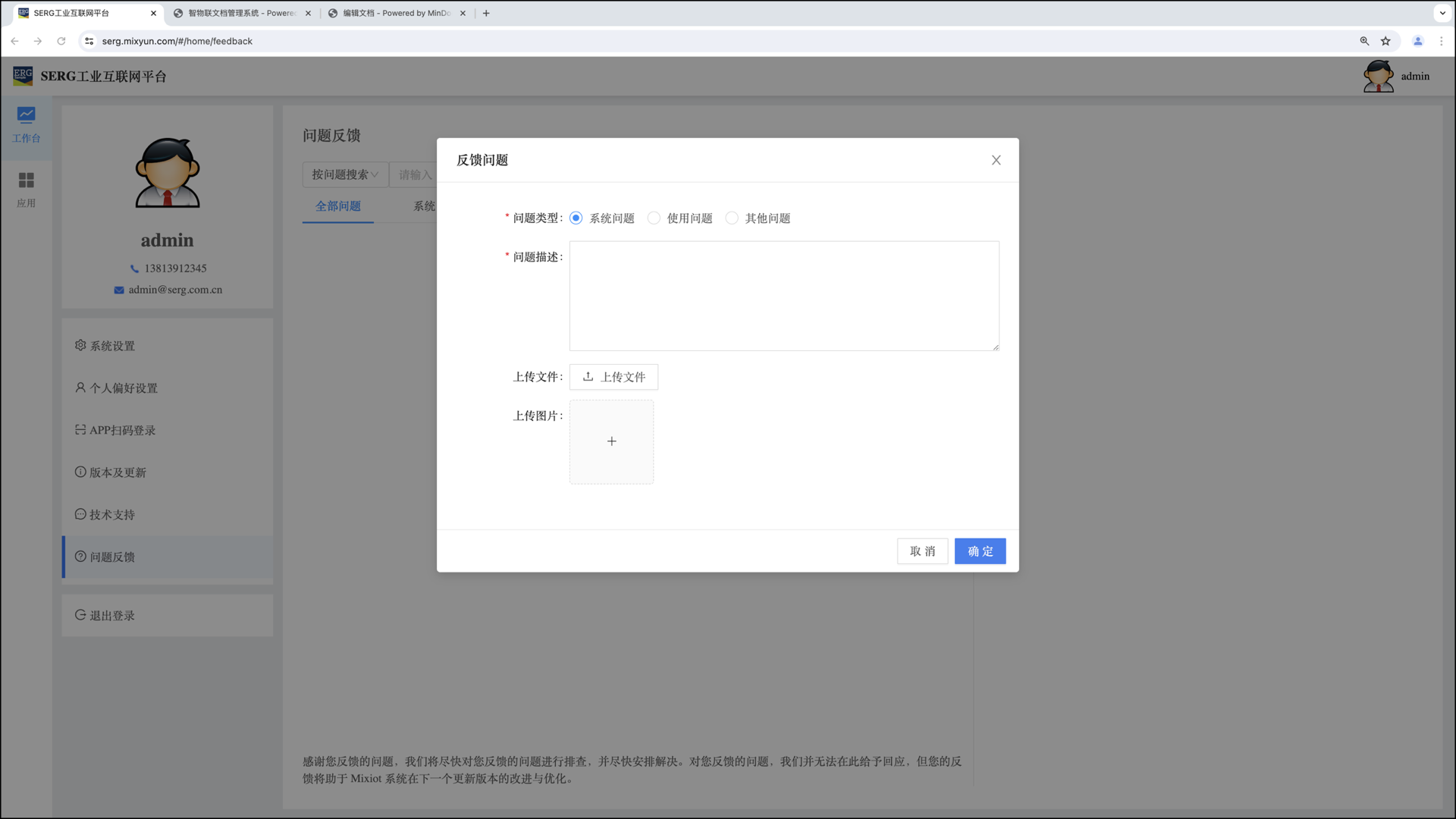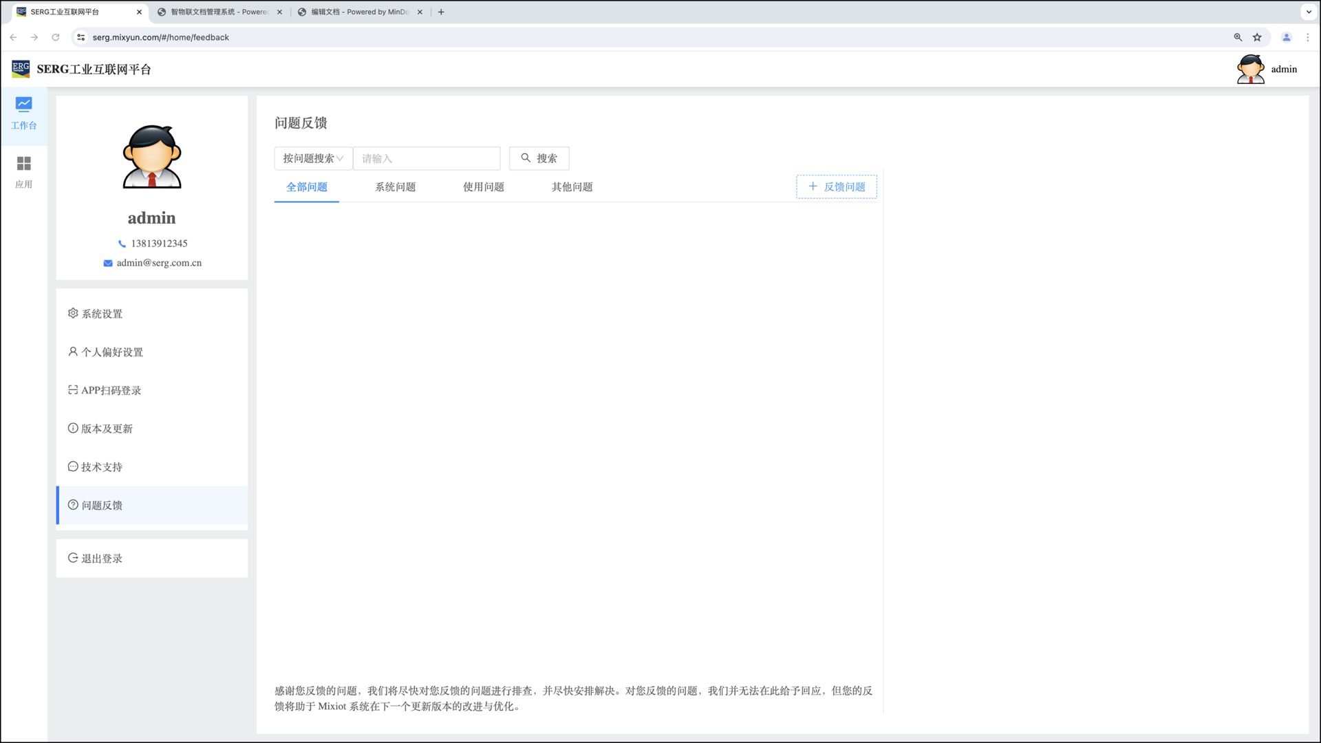 用户可以在使用过程,随时把所遇到的任何问题进行反馈,也包括用户对 Mixiot 平台系统各方面的意见和建议。