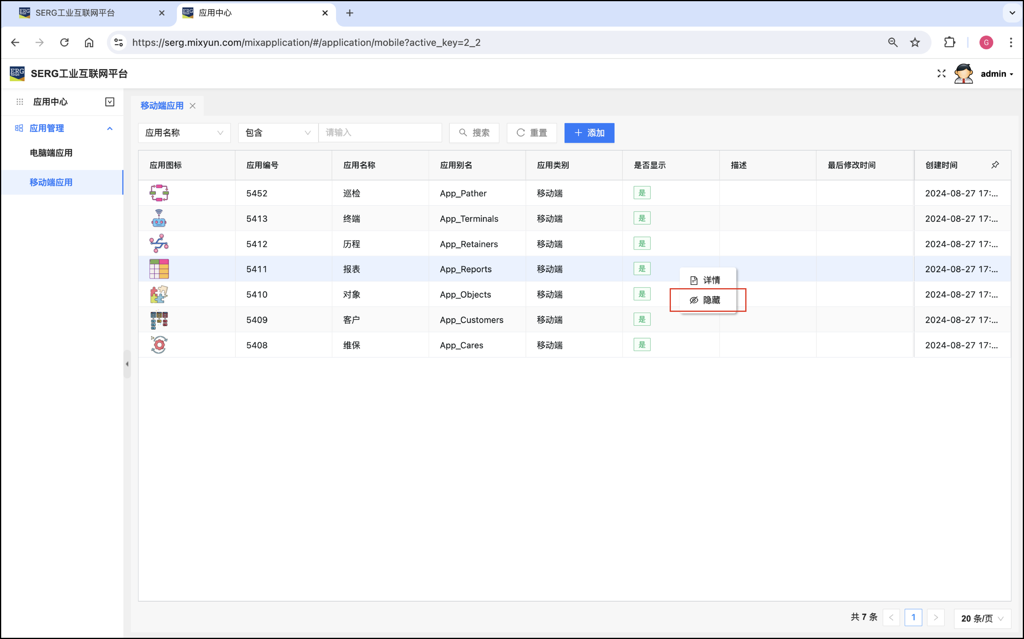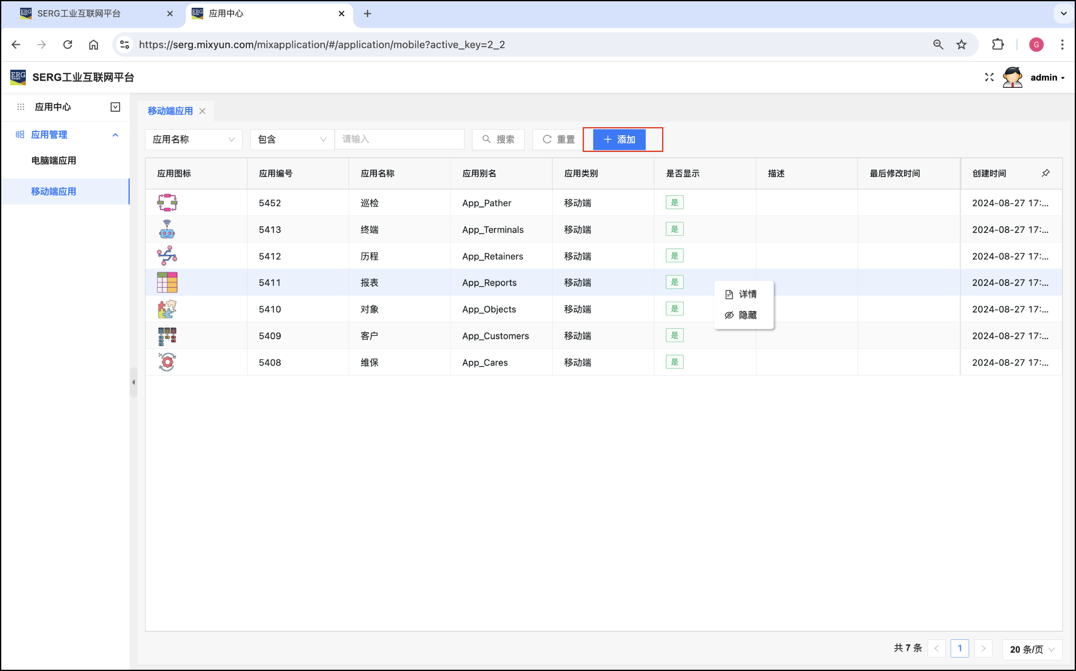 Mixiot App 体系是允许用户自己创建自己的应用。我们可以通过 “添加” 操作来添加 App 应用: