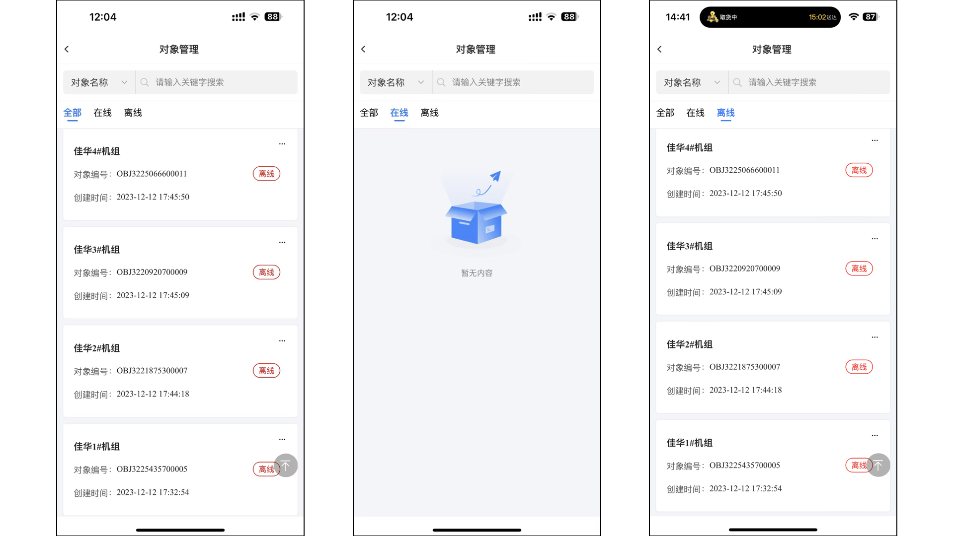 进入应用后,可以看到三个不同的视图列表,分别是,全部对象、在线对象 和 离线对象: