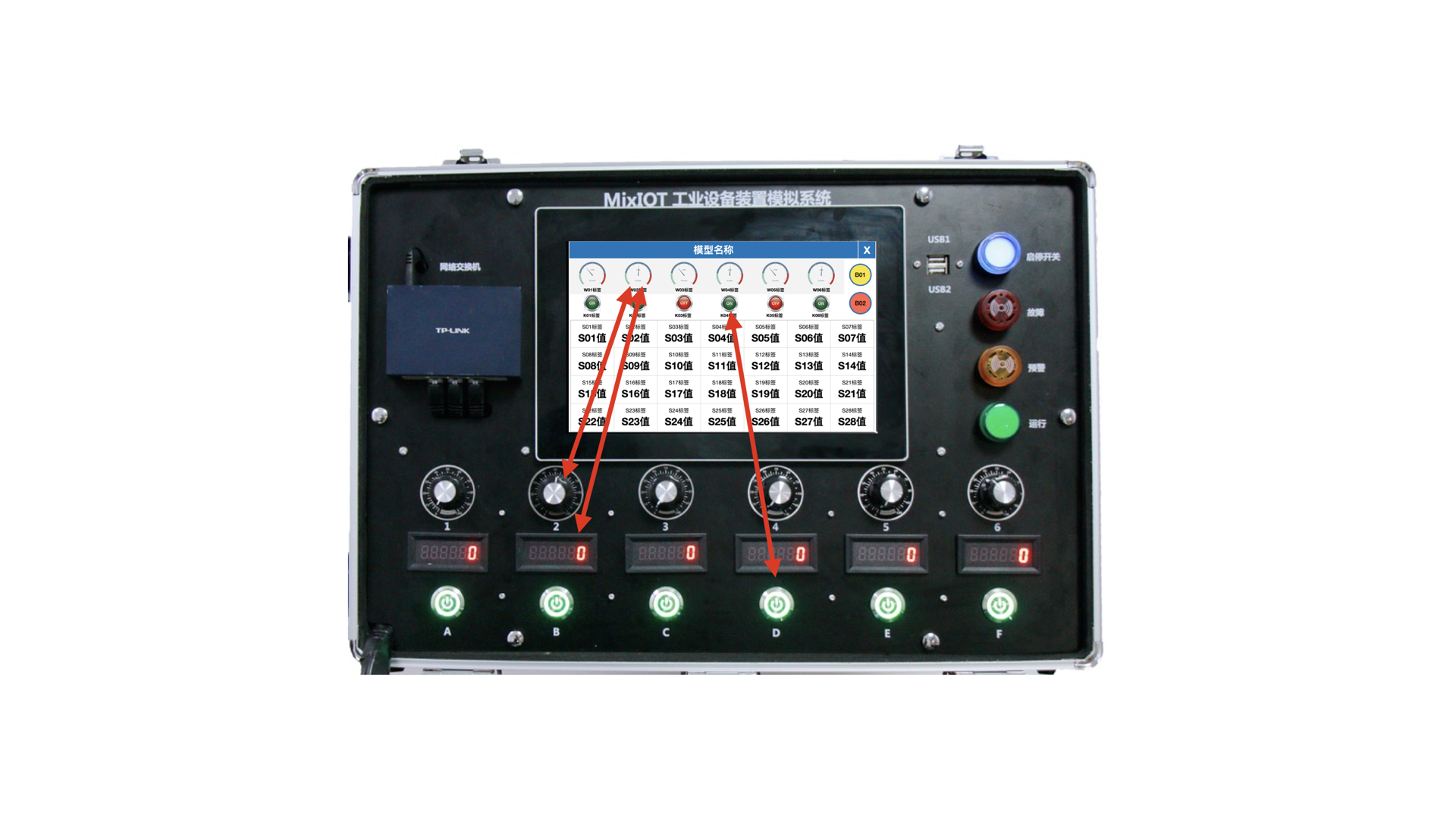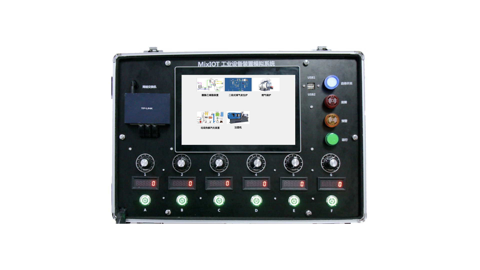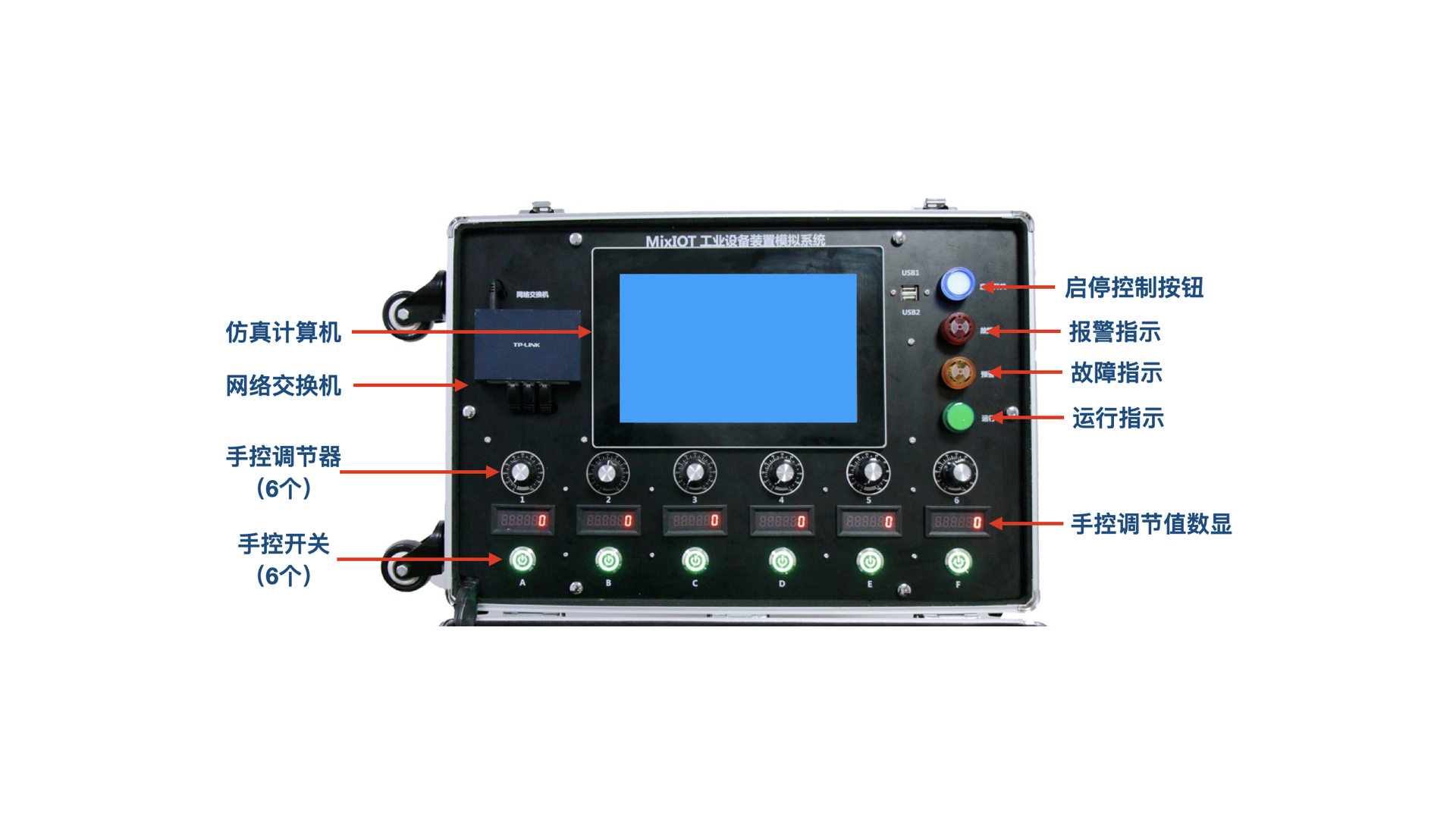 仿真模拟箱由上下两部分构成。上部分主要有仿真计算机,网络交换机,手控调节器、手控开关,启停开关,以及指示灯。