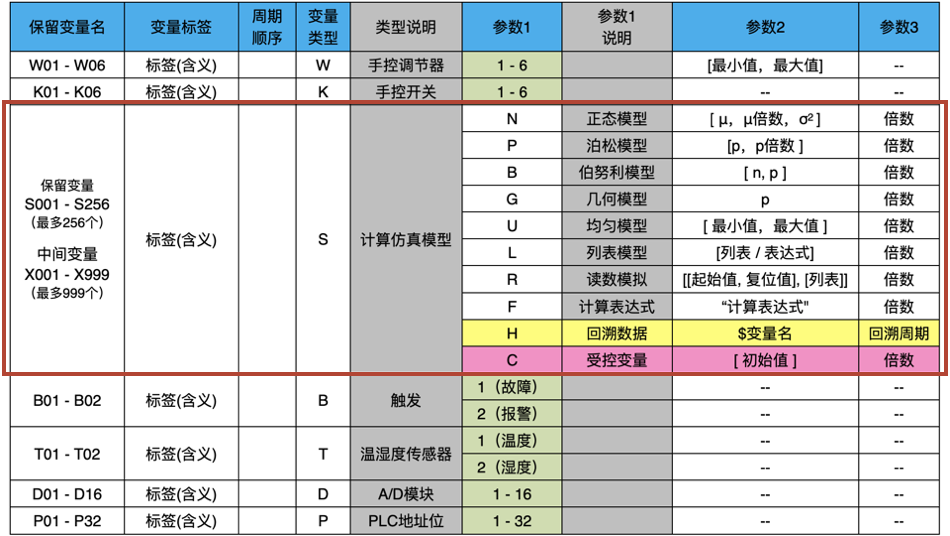 变量 S51、S52、S53 就是三个所谓的 “受控变量”,在 Simubox 程序运行的时候,这三个变量只产生一次,这个变量产生这一次的值大小,分别是 S51=35,S52=2.64,S53=123.45。在此之后,仿真程序便不再去理会这三个变量了,如果没有外部的干涉,这三个变量的值就一直不变。