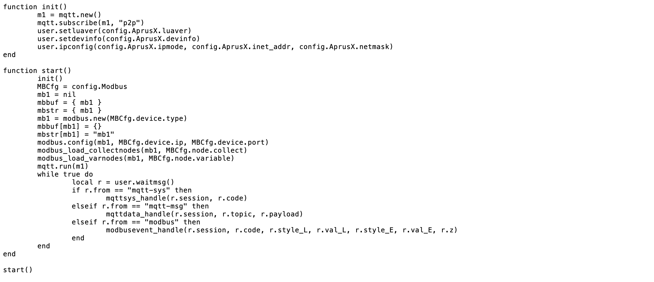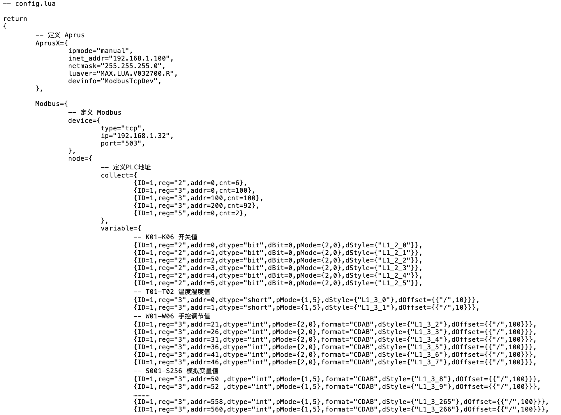 Simubox 中配有适配器 Aprus,用来采集 PLC 数据。Aprus 中已经烧录了标准的 Lua 程序,包括 aprus.lua 和 config.lua。程序代码如下:
