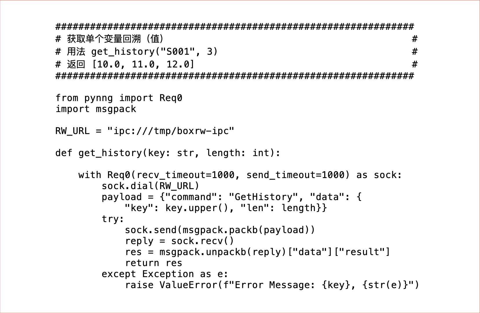 获取单个变量回溯(值)。变量回溯(值)是指获取某个变量前 1 ~ 59个周期的值。Simubox 系统对仿真变量的值仅保存最近 60 个模拟周期的数值(包括当前最新的变量值),所以,代码中的 len(回溯长度 length)的许可范围是 1 ~ 59,返回的是最近 len 回溯长度的全部变量(值);