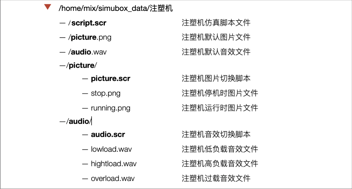 在 Simubox 仿真模拟系统中,“仿真模型” 包括三个东西:被模拟对象的图片,拟音(音效),和仿真脚本。“三件套” 分别对应三个文件,即 “图片文件”、“拟音(音效)文件”,和 “仿真脚本文件”。