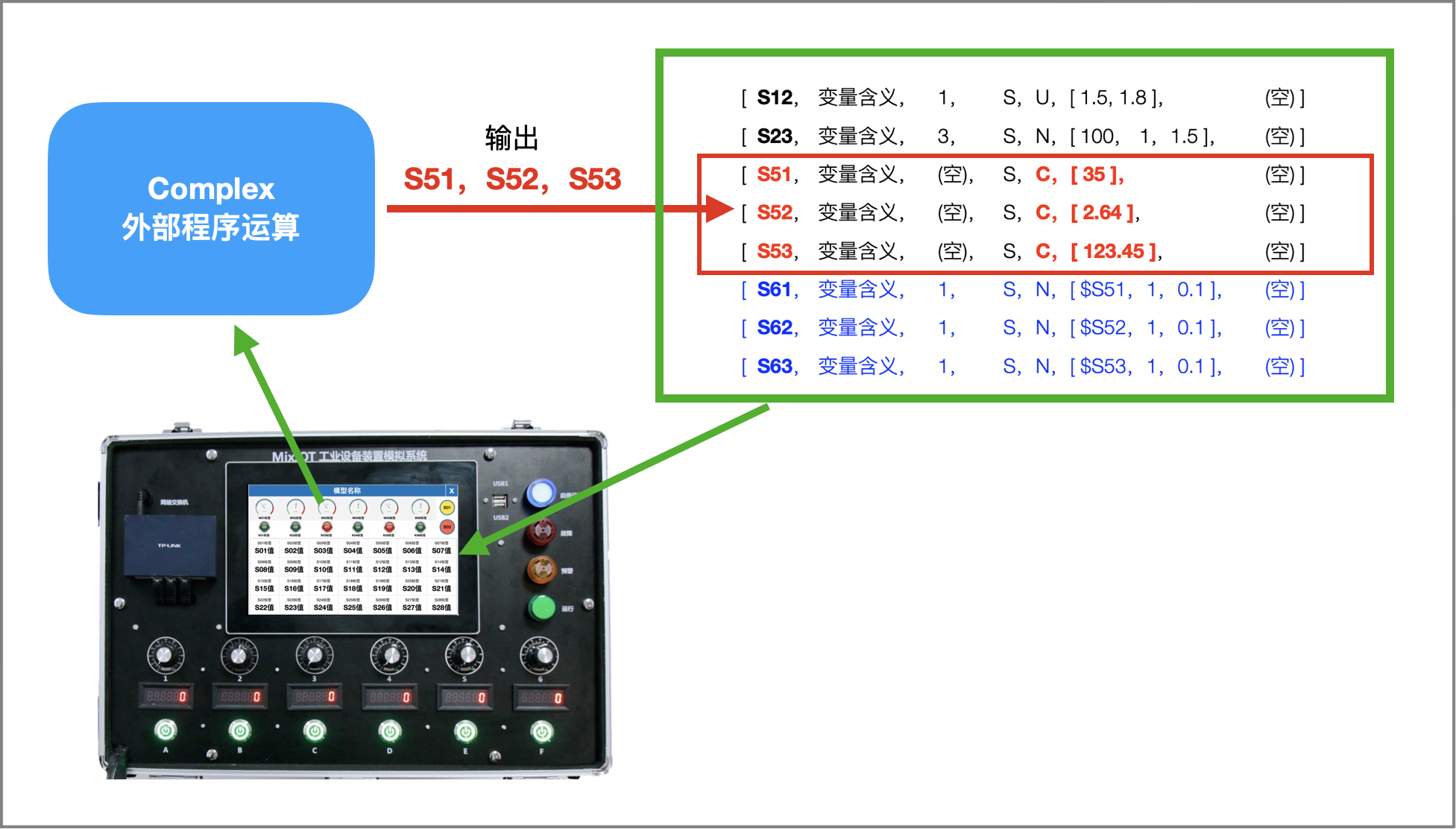 那么,这三个 C 的变量不再由 Simubox 仿真程序去控制了(因为不再去对这个变量进行模拟计算),其实就是交给 Complex 的算法模型去控制了,也就是说,这几个值是由 Complex 程序去改写了,S61,S62,S63 就会跟着发生变化;如果 Complex 算法不去改变,那就会一直维持之前的样子。