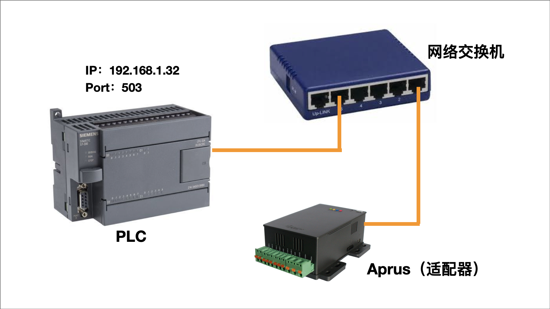Simubox 中的 Aprus(适配器)使用的是 Ethernet(网口)版本,连接到网络交换机,可以用 Modbus TCP 方式与 PLC 进行通讯。