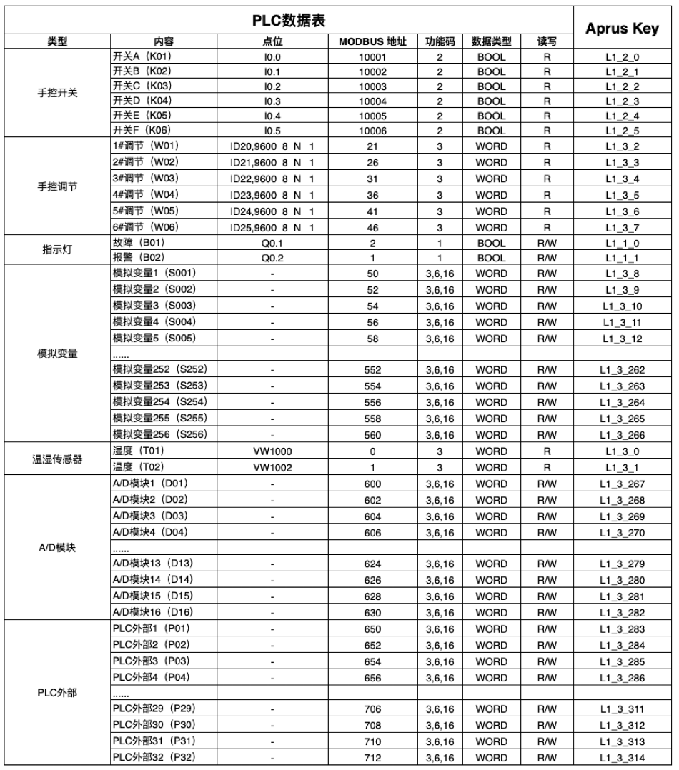 PLC 数据表及对应的 AprusKey 对照表如下,有了这个表,就可以在 Mixiot 系统中,编写映射表并建立他们之间的映射关系了。