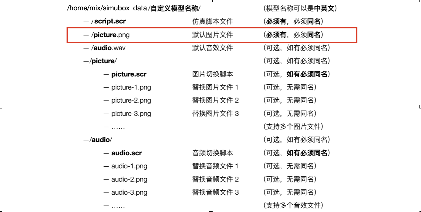 无论是否使用多组图片,默认的图片(文件)都是需要的,而且文件名是规定好的,必须是 picture,扩展名可以是 png、jpg、gif 等等。默认的图片文件将作为仿真对象的默认图片,出现在 Simubox 选择模型的时候。