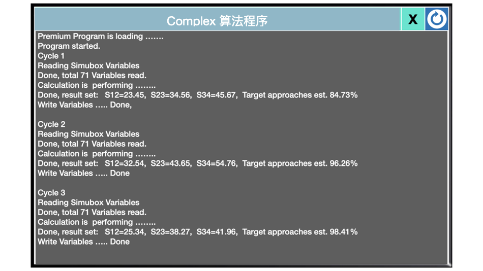 Complex 算法模型要算出个什么目的,这个是由它自己决定的,Simubox 则该干嘛干嘛,该怎么干怎么干,并不会因为有 Complex 的存在而改变什么,只是有些变量只是按脚本的要求,产生一次初始化的 S/C 变量值,仅此而已。